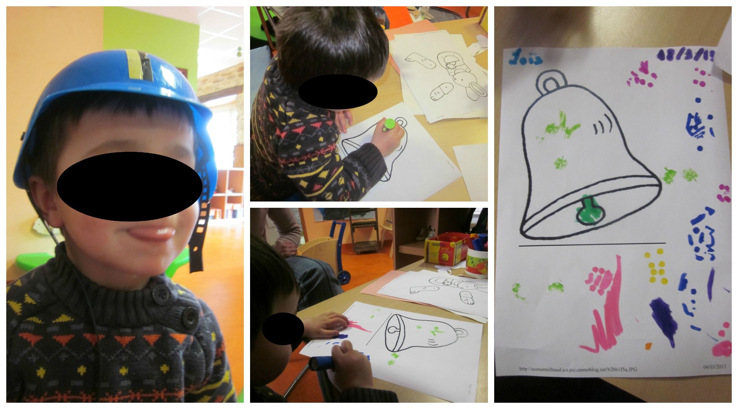 Il râle un peu, puis prend un feutre pour colorier !! Mais il dessine autour de la cloche !! Nous le lui faisons remarquer !! Il nous dit "oui" mais il continue !! Mais il discute et nous explique ses dessins : papa, la main, maman, le chien qui est parti, le chien qui salit la maison, maman qui jardine, etc !!