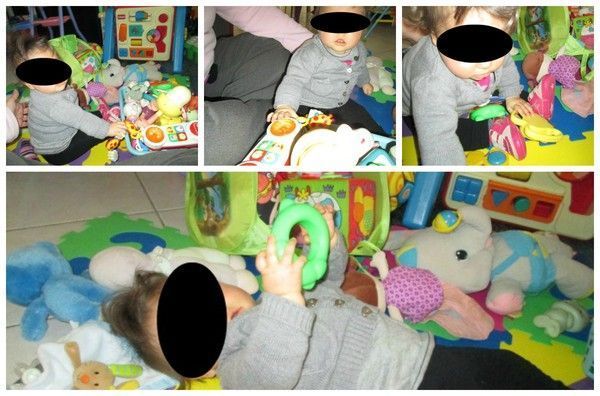 Célia tient un petit moment seule. Elle est concentrée sur les jouets qu'elle découvre et qu'elle prend. Je pose près d'elle ceux qu'elle a choisi et éloigne le panier. Trop de nouveautés à la fois ne sert à rien !!
