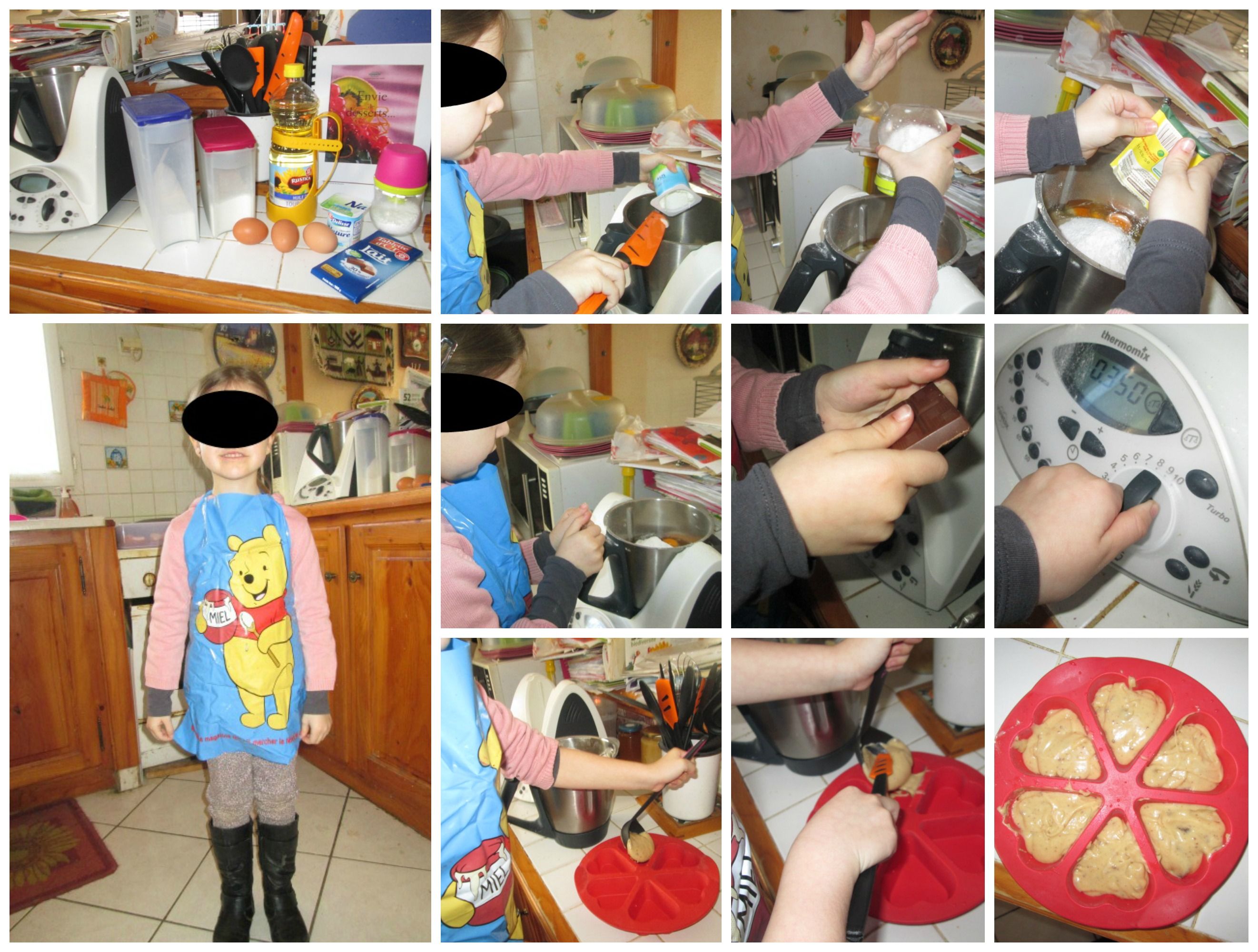 Maëline, mon petit chef, a vêtu sont tablier Winnie et réalise la majeure partie de la recette. Elle me laisse le soin de casser les oeufs !!
