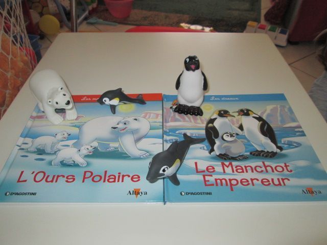 - le n°5 : le manchot empereur : le livre + la figurine + une figurine de la maman dauphin