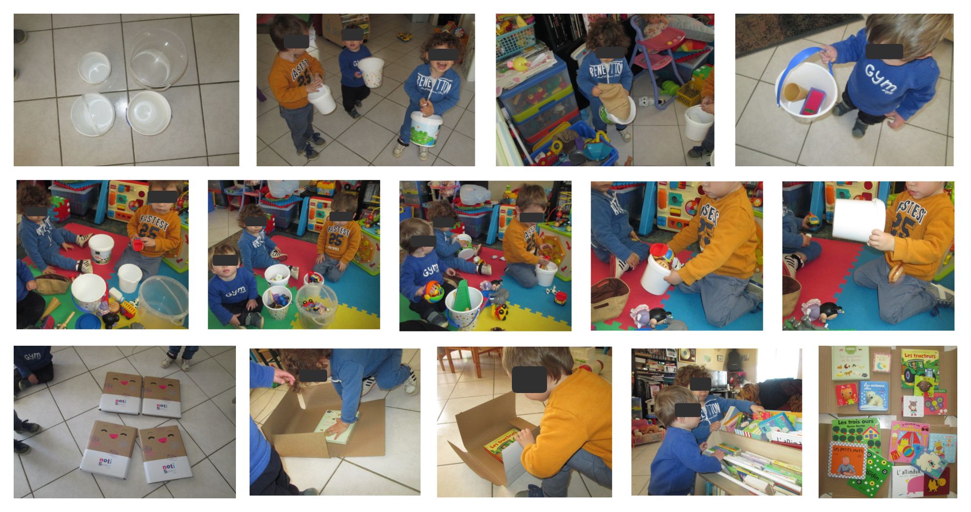 Nous le remplissons de jouets que nous aimons : la dînette, les véhicules, les animaux, les instruments de musique, etc.