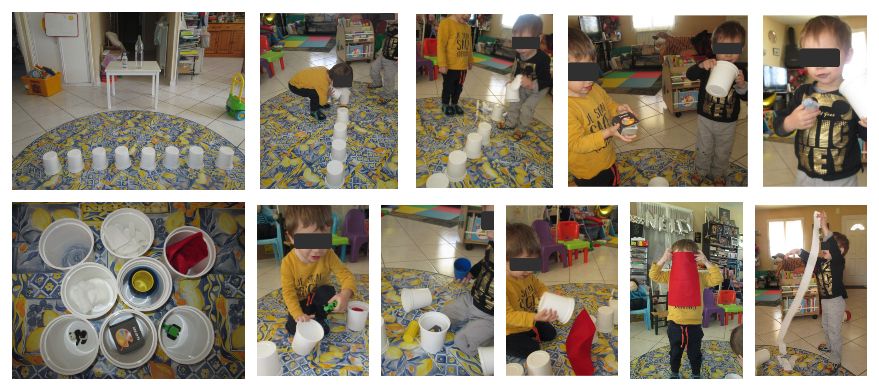 Nous avons refait cette activité plusieurs fois !! en mélangeant bien les seaux ! mais au fil des jeux, j'ai remarqué que les enfants, sachant ce qu'ils pouvaient trouver sous les seaux, essayaient de trouver un objet bien précis !!