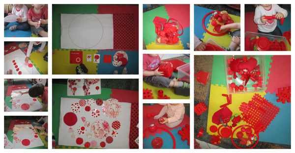 Je pose sur le tapis le bac rempli de jouets rouges : des coeurs, des hochets, des balles, des pions de la Daisy Box, des Marionnex, des briques en bois, des aimants, des cerceaux, de la dînette, etc (je vais essayer de proposer des bacs de couleur avec le même matériel !!) et je laisse les enfants découvrir le contenu et manipuler librement !