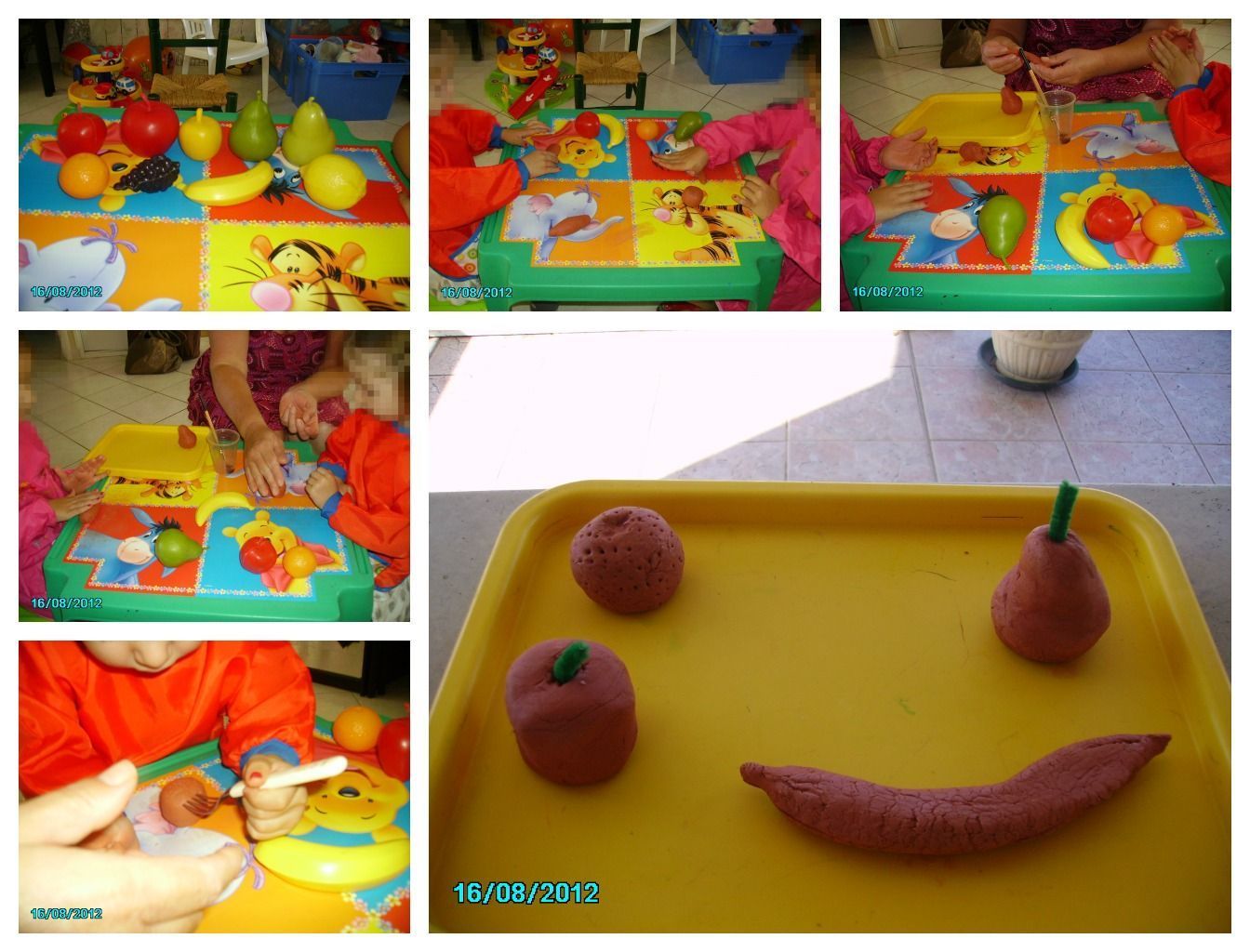 papier pate durcissante fruits couper modeler lisser pomme poire mandarine banane fond enfant découverte
