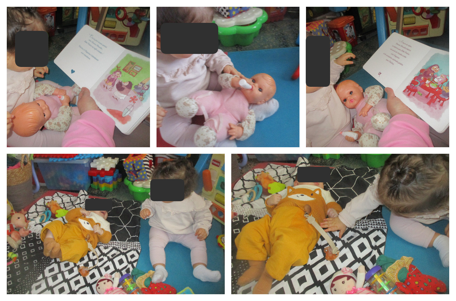 Je donne à Amalia un poupon pendant l'atelier ! elle le prend, lui donne et lui enlève son biberon !! bref elle semble s'en occuper !!