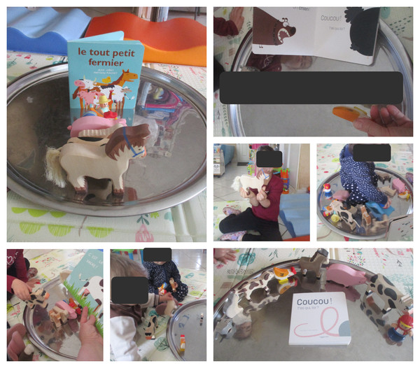Dans le plateau-miroir, j'ai préparé l'enfilade d'animaux de la ferme pour pouvoir suivre le livre en temps réel !